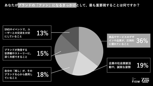 ブランドのファンになるきっかけとして最も重要視することは、「商品やサービスのデザインや品質が、圧倒的に優れていること」(36%) でした。次いで「企業の社会貢献活動や、誠実な姿勢」(19%) や 「ブランドが発信する世界観やストーリーに、深く共感できること」(15%) となっており 、本質的なプロダクトの価値こそがファン化の絶対条件となっています。