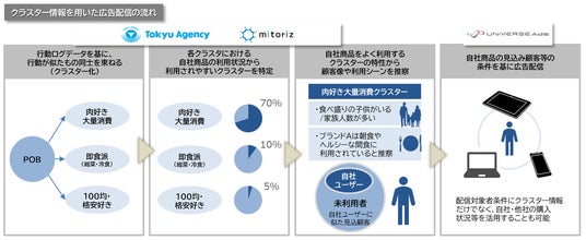 今回新たに提供を開始するのは、本年11月に株式会社東急エージェンシーと共同でリリースしたマーケティングダッシュボードサービス『Point of Buy-α』(以下、POB-α)と、東急エージェンシーのAIクラスタリングツール「Target Finder(R)」を融合させたマーケティングサービスをさらに発展させ、その情報を基にした広告配信サービスです。