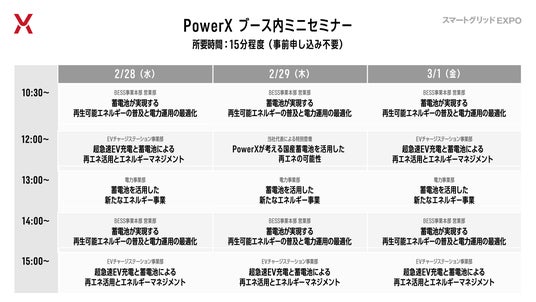 PowerXの蓄電池・EV充電・電力事業についてのセミナーをPowerXブース内で開催します。1回は約15分程度で、事前申し込みは不要でどなたでもご参加いただけます。