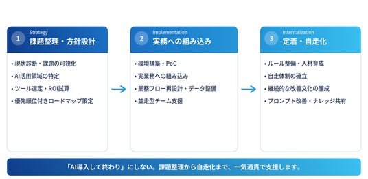 当社はこれまでの支援から、AIの価値を最大化するには単なるツール導入だけでなく、業務プロセスの再設計や人材育成、自走組織の構築まで包括的に取り組むことが不可欠だと認識を深めてまいりました。