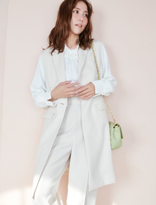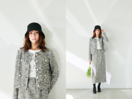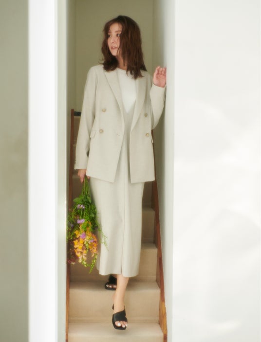同素材のジャケットとジャンパードレスはセット着用でさらにスタイリッシュに