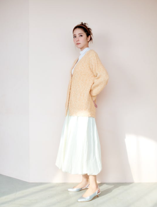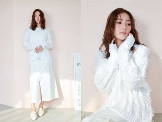 糸の表情と柄編みが特徴のファンシーヤーンニットはオールホワイトコーデで洗練されたムードに