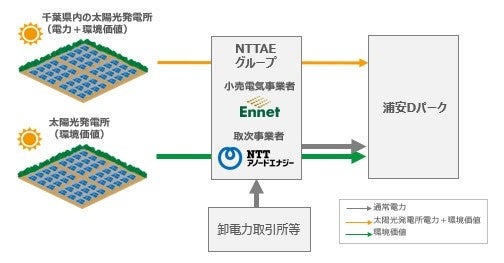 浦安DパークにおけるNTTアノードエナジーから提供※3する再エネの総電力量は、年間約10万kWh※4となる見込みで、オフサイトPPAによる太陽光発電の電力およびNTTアノードエナジー所有する発電所※5の非化石証書※6を活用することで、実質的に100%再エネの利用となります。これにより、温室効果ガス(以下、GHG)排出量の削減効果(非化石証書含む)は、年間174トンになる見込みです。また、オフサイトPPAによる太陽光発電は千葉県内にある太陽光発電所から浦安Dパークへ電力を供給することにより、エネルギーの地産地消にも貢献します。