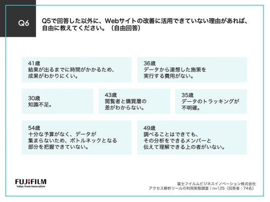 Q5で「わからない/答えられない」以外を回答した方に、「Q6.Q5で回答した以外に、Webサイトの改善に活用できていない理由があれば、自由に教えてください。(自由回答)」(n=125)と質問したところ、「調べることはできても、その分析をできるメンバーと伝えて理解できる上の者がいない」や「データから連想した施策を実行する費用がない」など74の回答を得ることができました。