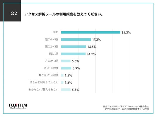 Q1で「自社で実施している」と回答した方に、「Q2.アクセス解析ツールの利用頻度を教えてください。」(n=289)と質問したところ、「毎日」が34.3%、「週に4~5回」が17.3%、「週に2~3回」が14.5%という回答となりました。