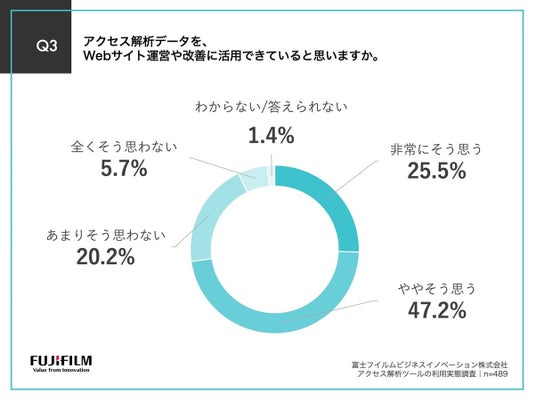Q1で「自社で実施している」「外注している」「一部外注している」と回答した方に、「Q3.アクセス解析データを、Webサイト運営や改善に活用できていると思いますか。」(n=489)と質問したところ、「非常にそう思う」が25.5%、「ややそう思う」が47.2%という回答となりました。