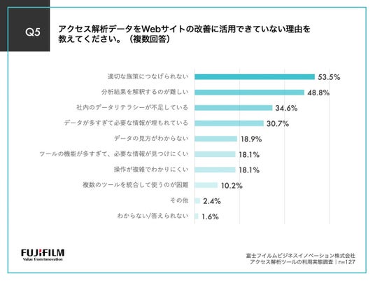 Q3で「あまりそう思わない」「全くそう思わない」と回答した方に、「Q5.アクセス解析データをWebサイトの改善に活用できていない理由を教えてください。(複数回答)」(n=127)と質問したところ、「適切な施策につなげられない」が53.5%、「分析結果を解釈するのが難しい」が48.8%、「社内のデータリテラシーが不足している」が34.6%という回答となりました。