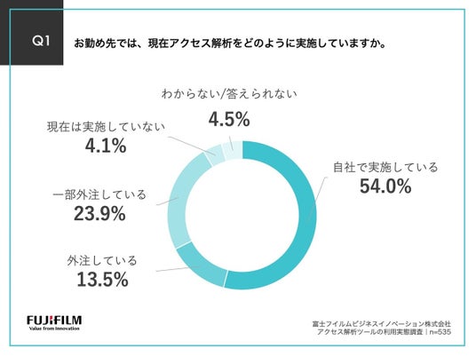 「Q1.お勤め先では、現在アクセス解析をどのように実施していますか。」(n=535)と質問したところ、「自社で実施している」が54.0%、「外注している」が13.5%、「一部外注している」が23.9%という回答となりました。