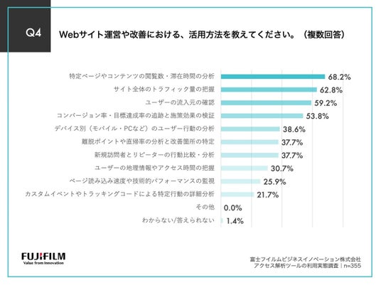 Q3で「非常にそう思う」「ややそう思う」と回答した方に、「Q4.Webサイト運営や改善における、活用方法を教えてください。(複数回答)」(n=355)と質問したところ、「特定ページやコンテンツの閲覧数・滞在時間の分析」が68.2%、「サイト全体のトラフィック量の把握」が62.8%、「ユーザーの流入元の確認」が59.2%という回答となりました。