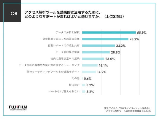 「Q8.アクセス解析ツールを効果的に活用するために、どのようなサポートがあればよいと感じますか。(上位3項目)」(n=535)と質問したところ、「データの分析と解釈」が55.9%、「分析結果を元にした施策の立案」が48.2%、「自動レポートの作成と共有」が34.2%という回答となりました。