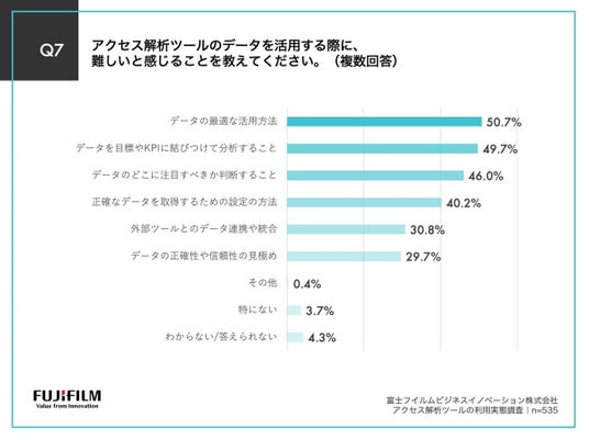 「Q7.アクセス解析ツールのデータを活用する際に、難しいと感じることを教えてください。(複数回答)」(n=535)と質問したところ、「データの最適な活用方法」が50.7%、「データを目標やKPIに結びつけて分析すること」が49.7%、「データのどこに注目すべきか判断すること」が46.0%という回答となりました。