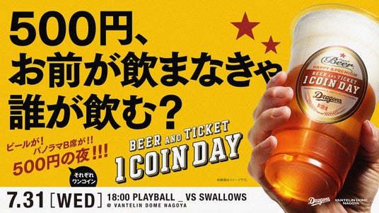 (株)中日ドラゴンズと(株)ナゴヤドームは、7月31日(水)のヤクルト戦と8月28日(水)の広島戦で、バンテリンドーム内売店および売り子が販売する生ビール1杯を500円で楽しめるワンコインデーを今シーズンも実施します。