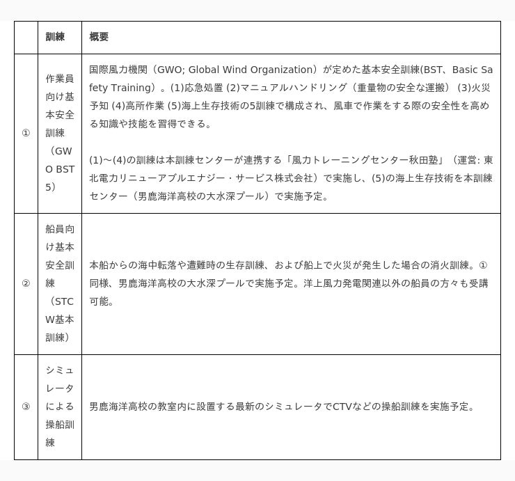 当社は日本海洋事業株式会社とのコンソーシアムで、船員や洋上風力発電の作業員を育成する訓練センター「風と海の学校 あきた」(以下「本訓練センター」)を2024年4月に秋田県立男鹿海洋高等学校(以下「男鹿海洋高校」)内で開所します。本訓練センターは1.作業員向け基本安全訓練(GWO BST5) 2.船員向け基本安全訓練(STCW訓練) 3.シミュレータによる作業員輸送船(CTV*など)の操船訓練を提供する予定です。本訓練センターでは年間1000人程度の訓練修了生輩出を目指すとともに、男鹿海洋高校の生徒や近隣の小中学生などにも開放し、将来的な海事人材の育成にも貢献します。