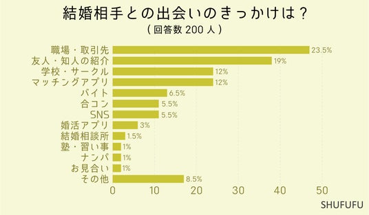 結婚相手との出会いのきっかけは?の問いに対して最も多かったのが「職場・取引先(23.5%)」でした。 次いで「友人・知人の紹介(19%)」「学校・サークル(12%)」という結果でした。社会人になると出会いが職場になる場合が多いみたいですね。