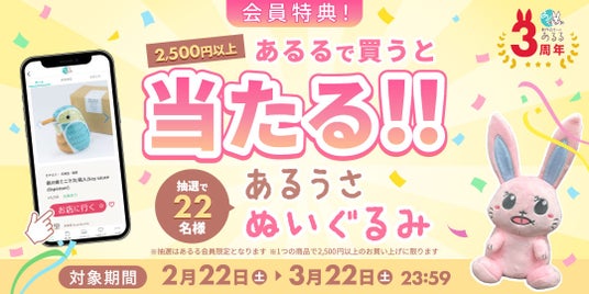 株式会社システムリサーチ(本社:愛知県名古屋市)が運営している「創作品モールあるる」(以下、あるるモール)は、2025年3月22日の3周年を迎えるにあたり、2025年2月22日(土)~ 2025年3月22日(土)までの期間、『【あるる3周年キャンペーン】あるるでお買い物をしてあるうさぬいぐるみを当てよう!』を開催いたします。