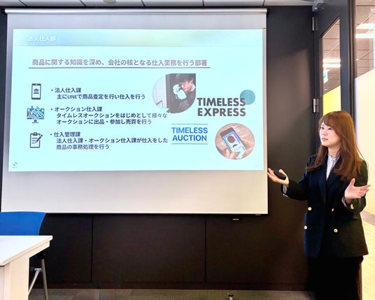 株式会社タイムレスは2025年4月20日(日) 25:25~放送開始のフジテレビ『タイムレスマン』にて紹介されました。株式会社タイムレスのメインオフィスである豊洲オフィスにtimeleszメンバーの8人にお越しいただき、撮影が行われました。timeleszメンバーが「先輩にご挨拶」をすることになり、株式会社タイムレス社員とtimeleszメンバー全員にサプライズで撮影が始まりました。弊社会社紹介のあと、代表取締役社長の馬場からも「一緒にタイムレスを盛り上げたい」といった言葉があり、timeleszメンバーからも「ありがたい」といった反応もありました。その後は弊社が査定した想定金額を基に「timeleszオークションプロジェクト」企画が実施されました。総合買取サロンタイムレスの店舗を運営する、店舗営業部部長の岡根を中心にtimeleszメンバーのお品物を査定し、協力させていただきました。