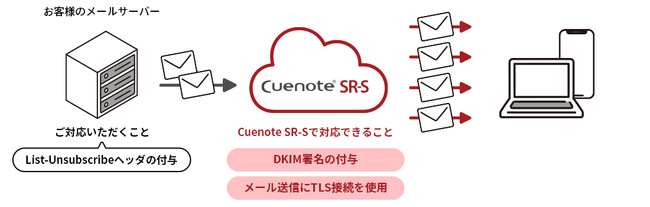 「Cuenote SR-S」を導入することで、「DKIM署名の付与」、「gmail.comおよびgooglemail.comに対しTLS接続を使用したメール配信」に対応できるため、お客様によるシステム変更は最小限とすることができます。