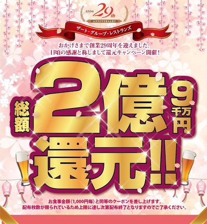 ワールドリカーインポーターズ株式会社/株式会社ザート商会(本社:東京都港区 代表取締役:今里尚史)が運営するザートグループレストランは、おかげさまでたくさんのお客様にご愛顧いただき創業29周年を迎えることができました。29周年特別企画として、割引総額2億9千万円分のプレミアムクーポンを2022年3月22日(火)より各レストラン(※一部店舗を除く)にて発行いたします。