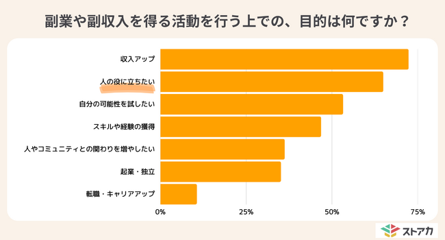 副業や副収入を得る活動において、目的について尋ねた結果、「収入アップ」(72%)が第1位でした。第2位の目的は「人の役に立ちたい」(64%)であり、収入アップに次ぐ高い割合をしめしました。昨年の調査では「人の役に立ちたい」と答えた方は46%だったことから、大幅に増加していることがわかります。