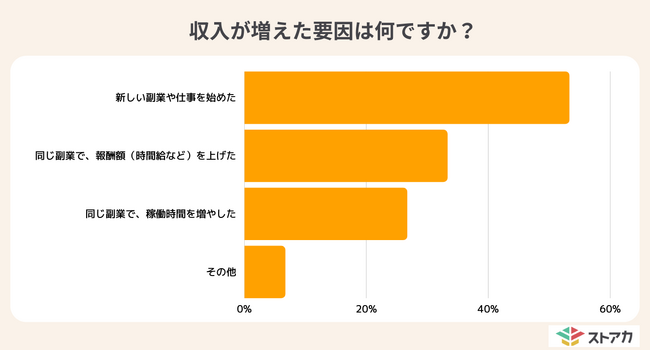 この結果から、全体的に副業による収入額が増加している傾向が伺えます。収入が増えた要因として「新しい副業や仕事を始めた」という回答が最も多く、次いで「同じ副業で報酬額を上げた」という結果になりました。