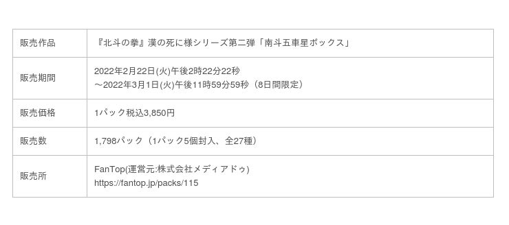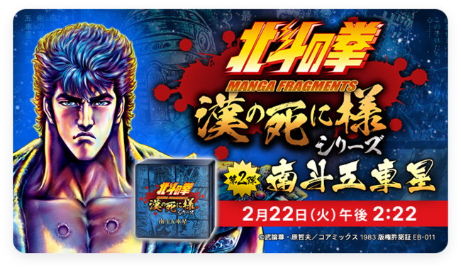 株式会社メディアドゥ(東証第一部 3678、本社:東京都千代田区、代表取締役社長 CEO 藤田恭嗣、以下「メディアドゥ」)運営のNFTマーケットプレイス「FanTop」は、株式会社コアミックス(本社:東京都武蔵野市、代表取締役社長 堀江 信彦、以下「コアミックス」)と共同で、NFTファンアイテム「『北斗の拳』Manga Fragments 漢の死に様シリーズ」第二弾「南斗五車星ボックス」の販売を2022年2月22日午後2時22分より開始いたします。