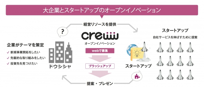 この取り組みでは、すでに具体的なアイデアを持つスタートアップ企業から協業案の募集を行い、かつブラッシュアップをオンライン上で行うため、早期に事業化へと進めることが可能となります。本プログラムの枠組みを提供するcrewwは、スタートアップ企業の選定からマッチング、新規事業創出までの過程を、ドウシシャと共同で行います。