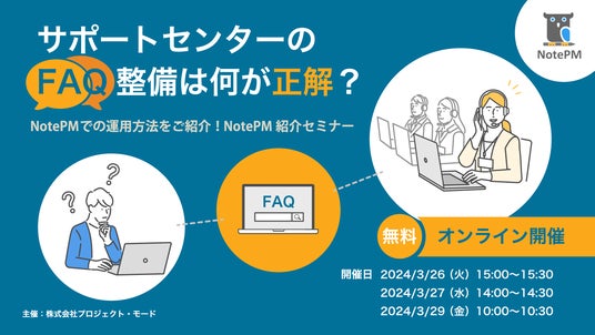 株式会社プロジェクト・モードが提供するナレッジマネジメントSaaS「NotePM ( https://notepm.jp )」は、オンラインセミナー『サポートセンターのFAQ整備は何が正解?NotePMでの運用方法をご紹介!NotePM紹介セミナー』を開催いたします。