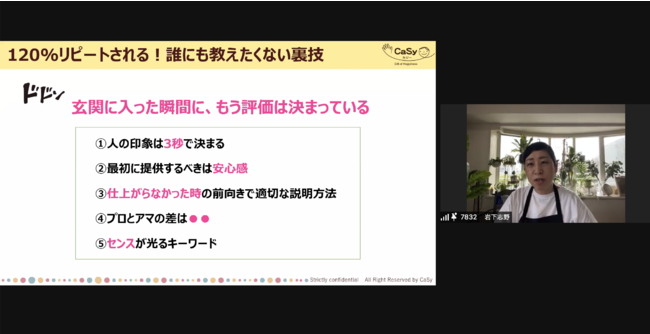 株式会社CaSy(本社:東京都品川区、代表取締役CEO:加茂雄一、以下カジー)は5月26日(木)、カジーの家事代行スタッフ(以下キャスト)の日頃の活躍を讃え、また感謝を伝えるための年に一度の恒例行事「キャストセッション2022」をオンライン開催しました。今年の目玉は、カジーのトップキャストが講師となって展開する家事代行のスキルアップやモチベーションにつながるプログラム。のべ580人のキャストが参加し、仲間たちと学びや交流を深め合った当日の様子をレポートします。女性の雇用創出・リーダー育成・起業家支援等に取り組む株式会社 Will Lab 代表取締役 小安 美和氏と、元AERA編集長でジャーナリストの浜田 敬子氏をゲストに迎えたクロストークも実施しました。