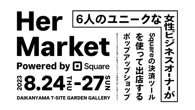 Square(スクエア、本社:米国Block, Inc.<ブロック>、Block Head:ジャック・ドーシー)は、女性事業主を応援するプロジェクト「彼女たちの選択」の一環として、個性豊かなビジネスを行う女性事業主がポップアップストアを出店し、お客さまに直接販売を行う「Her Market」を2023年8月24日(木)から27日(日)までの4日間、DAIKANYAMA T-SITE GARDEN GALLERYで実施します。イベント初日には、女性のビジネス展開をテーマにした有識者によるトークセッションも実施します。