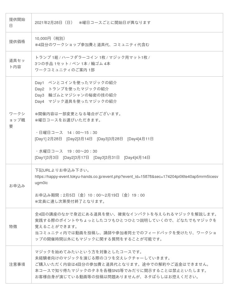 本サービスの初回は”手品”をテーマに、必要な道具、講師によるレクチャー、一緒に切磋琢磨する仲間を集めたコミュニティなど、在宅でもオンライン完結でお楽しみいただけるパッケージとして、2月28日(日)より提供開始します。