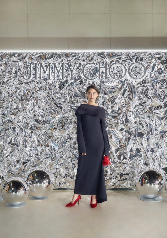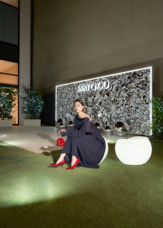 「The JIMMY CHOO Silver Garden」オープンに伴い、12月5日(木)に行われた点灯セレモニーに俳優の山本美月が登壇。水のしずくにインスパイアされたドロップヒール、ラメモール素材のティンセルが華やかなレッドシューズIXIAと、同じ素材をあしらったアイコンバッグMICRO BON BONを着用し、ホリデーにぴったりなコーディネートを披露した。