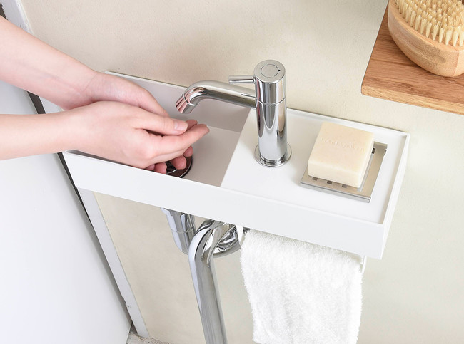 住宅設備機器と建築資材のインターネット販売を行う株式会社サンワカンパニー(所在地:大阪市北区茶屋町19-19 代表取締役社長:山根 太郎)は、世界最小クラスのコンパクトなサイズ感、奥行きわずか12cmのステンレス小型手洗い器《テハチ》を5月27日(金)に発売いたしました。