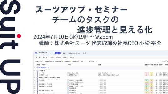 株式会社スーツ(所在地:東京都千代田区、代表取締役社長CEO:小松 裕介)は、2024年7月10日(水)19時から、当社代表の小松が講師を務めるスーツアップ・セミナー「チームのタスクの進捗管理と見える化」を無料開催します。