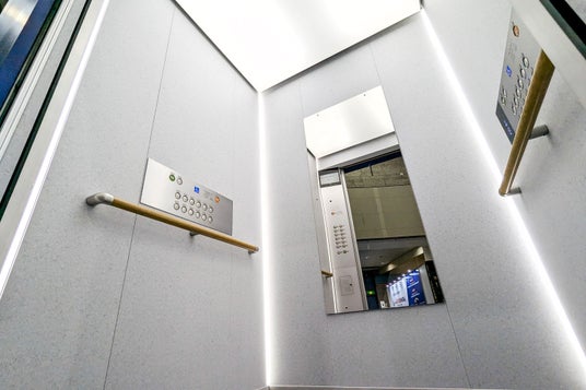 Gen3エレベーターは、かごの四隅から天井にのびるLED照明を備えたAmbianceデザインを採用