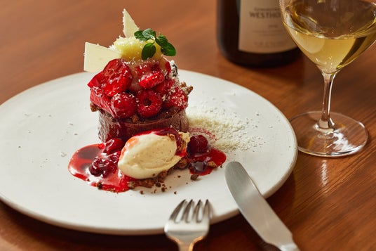 メインダイニングTRUNK(KITCHEN)にて、2月10日(月) - 2月28日(金)の期間限定でバレンタインデザートを提供いたします。カカオの香りが広がるチョコレートタルト生地に、くちどけの良いホワイトチョコのムース、ラズベリーやストロベリーなど旬のベリーを数種類使用し、カシスのソースでまとめ、ベリーの⽢酸っぱさを引き立てました。アクセントに、柚子のソースとシナモン、クローブ、ナツメグの香りをあわせたオールスパイスのクランブルをトッピングし全体の味を引き締めています。ホワイトチョコレートの軽やかな⽢さと、スパイシーな香りが、大人のバレンタインを演出します。