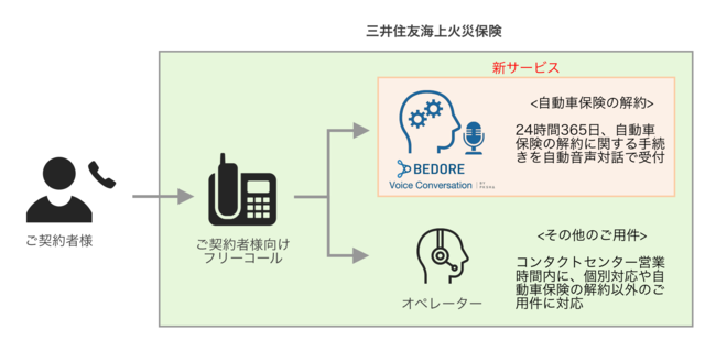 三井住友海上では3月10日より、「BEDORE Voice Conversation」を活用した自動車保険解約受付の自動化を開始します。お客様は、24時間365日待ち時間なしで自動車保険の解約を電話で申し込むことが可能となり、利便性が向上します。