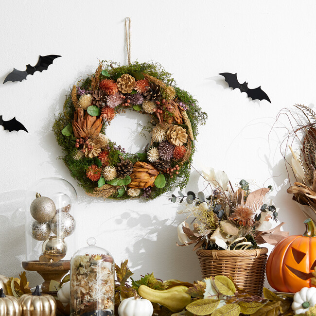 ふわっとした葉をベースに、アーティチョークの蕾や松ぼっくりなど天然素材をあしらったナチュラルなリースです。ハロウィンカラーのオレンジとパープルが、インテリアに華やかなムードを演出します。
