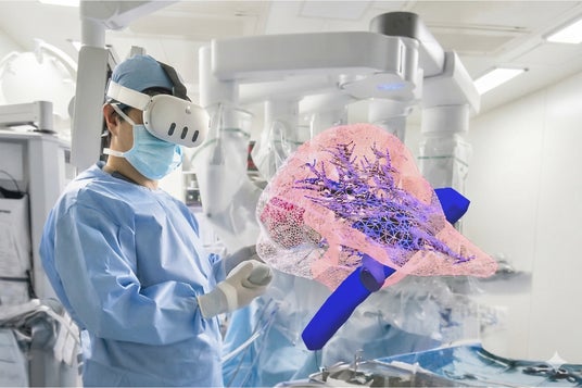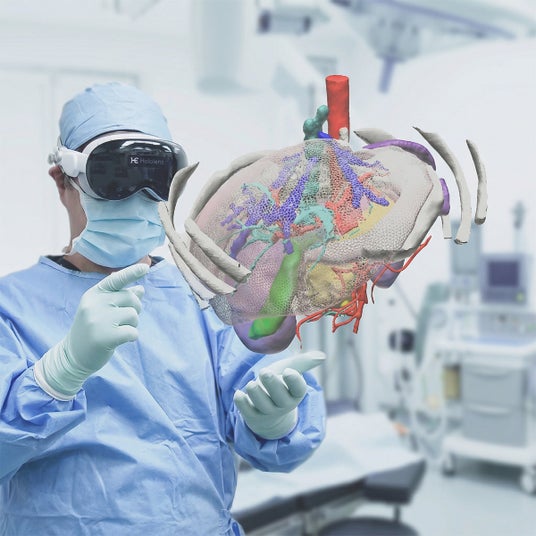 Holoeyes MDは、CTやMRIなどの医用画像をクラウド上で空間コンピューティングに対応した3Dモデルへ変換し、仮想空間および現実空間に表現する、医療機器認証を受けた医療用画像処理ソフトウェアです。病態の特徴や臓器の奥行き等、平面モニタ上では伝わりにくい立体空間的な情報を得ることができます。医療機関での診断治療計画や手術手技のシミュレーションなど、主に外科領域で用いられていますが、医学教育、研修などにも活用されています。
