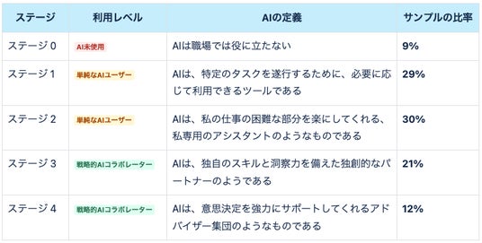 ステージ4のAIコラボレーターのほぼ全員(94%)が、AIとの協働を学ぶために費やした時間は報われると同意しているのに対し、ステージ1のAIユーザーでは59%にとどまっています。