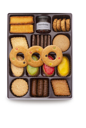 【内容】クッキー400g、コンフィチュール45g(サボイ フィンガー・コンフィチュール フランボワーズ・スプライズ・バター サブレ・ディアマン ショコラ・スペキュロス・ココナッツ クッキー・リング ターツ・マカロン クッキー・ピーナッツ クッキー・ショコラ クリーム フィンガー・ウォルナッツ クッキー)