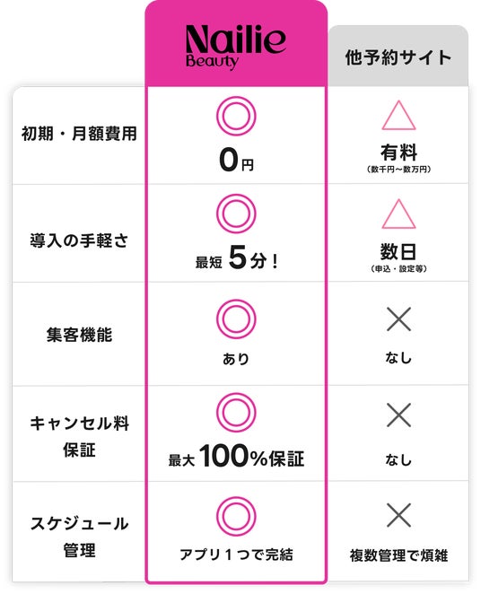 そこで「Nailie Beauty」は、自身のSNSに貼り付けるだけで、キャンセル料保証付きの予約システムが利用できる「SNS専用予約リンク(集客手数料0円)」をリリース。予約の自動化による業務効率化だけでなく、個人では導入が難しい「キャンセル料の自動徴収」を実現し、技術と接客に100%集中できる環境を提供します。
