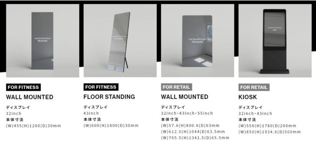 「スマートミラー2045」は、 AndroidOSを標準搭載し、各種アプリをインストールして使用できる等身大サイズのタッチパネル式ミラーです。店舗・オフィス・街中で、これまでの鏡やディスプレイの代わりとなり、新たな体験を生み出します。商品提案、接客、広告、メイク、ファッション、フィットネス、ゲーム等のシーンでの活用可能性があります。現在、百貨店、アパレル 、美容院、オフィス、化粧品メーカー、などさまざまな業種・業態での導入されており、デジタル化による業務効率化にとどまらない新たな顧客体験の創造に貢献しています。