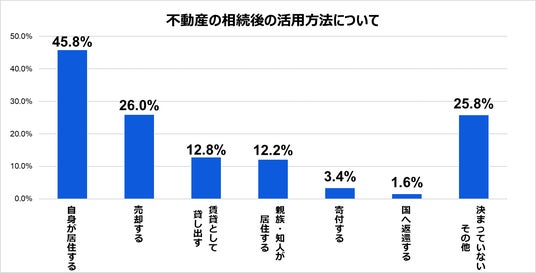相続した、もしくは今後する可能性のある不動産の形態については、実家・親族の自宅(一戸建て)が最も多く約7割の方が回答しました。相続後の活用方法(予定も含む)は、最も多かったのが“自身が居住する”の45.8%、続いて“売却する”が26.0%、“賃貸物件として貸出する”が12.8%という結果になりました。