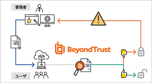 このような背景から当社は、エンドポイントにおける管理者権限をユーザーに与えずに端末の運用を可能にするBeyondTrust(ビヨンドトラスト)社の特権アクセス管理ソリューション「Privilege Management for Windows」の取り扱いを開始しました。ユーザーの権限を最小権限まで制限し、業務上必要な操作においてはローカル管理者権限を渡すことなく「Privilege Managementfor Windows」での管理のみで実行を許可することが可能です。これによりユーザーの利便性を変えることなく管理者の工数を軽減し、コンプライアンスで要求される最小権限での運用を実現します。攻撃の対象となるエンドポイントで動作するものすべてを認証することで、事後対応ではなく予防的アプローチによる生産性とセキュリティの両立を可能にします。