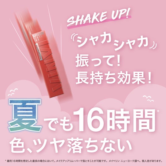 #落ちないリップ*1 着用16時間を想定した最長の場合において。メイクアップリムーバーで落とすことが可能です。メイベリン ニューヨーク調べ。