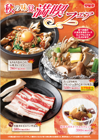 販売メニュー:「もりもりきのこの石焼カレービビンバ」、「たっぷり秋のフレッシュきのこホイル焼き」、「国産黒豚カルビ エリンギ添え」、「焼き芋のスイートエスプレッソ」