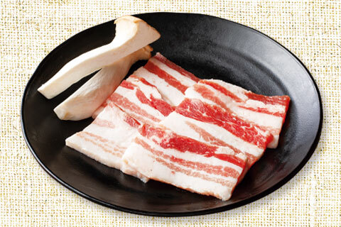 旨みの濃い国産黒豚カルビと、さっくりと割いたエリンギを網で焼いて素材のおいしさをお楽しみください。お肉でエリンギを軽く巻いて、溶け合う味わいや食感の組み合わせを楽しんでいただくのもおすすめです。