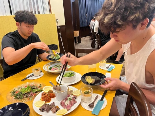 シカ肉を使った料理などの美味しい料理を食べながら、チームで食事や会話を楽しむ時間を過ごしました。