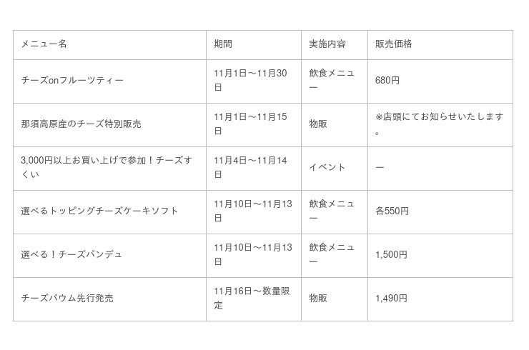 また、ソラマチ店で開催するチーズフェアにあわせて11月1日(火)からは限定ドリンク「チーズonフルーツティー」が新登場します。フレッシュフルーツを使った大人気のフルーツティーにチーズクリームをトッピング。チーズフェア限定ドリンクとなりますので、ぜひお楽しみください。