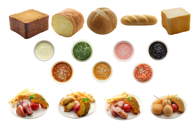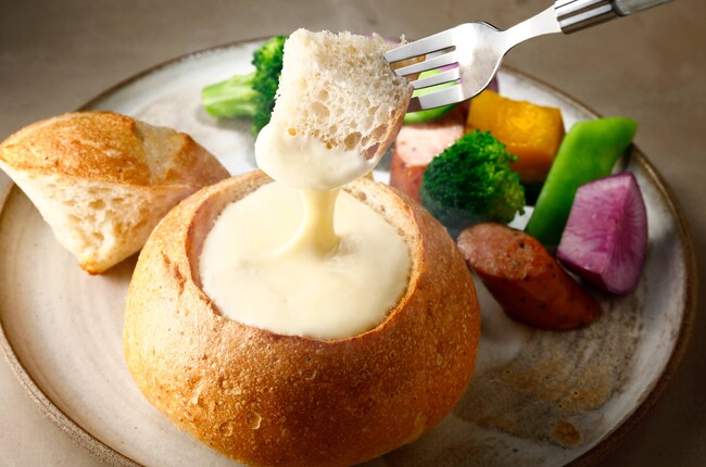 『選べる!チーズパンデュ』は、5種類のパン、7色のチーズソース、4種の付け合わせを組み合わせてお楽しみいただく商品です。パンはブール、ミニ食パン、円柱パン、黒食パン、ソフトフランスパンの5種類。形や食感、味わいの異なるパンをトーストし、くりぬいた中にチーズソースを流し込みます。チーズソースは定番のチーズソースに加え、チーズと相性が良いラタトゥイユ、ほうれん草、エビのビスク、かぼちゃ、ビーツポテト、イカ墨の全7種類。カラフルな7色でありながらすべて自然素材で色付けをしているため、素材本来の優しい味わいがお楽しみいただけます。付け合わせにはポテトや野菜に加えて、ベーコンやチーズボールなどバラエティー感あふれるラインナップをご用意しています。
